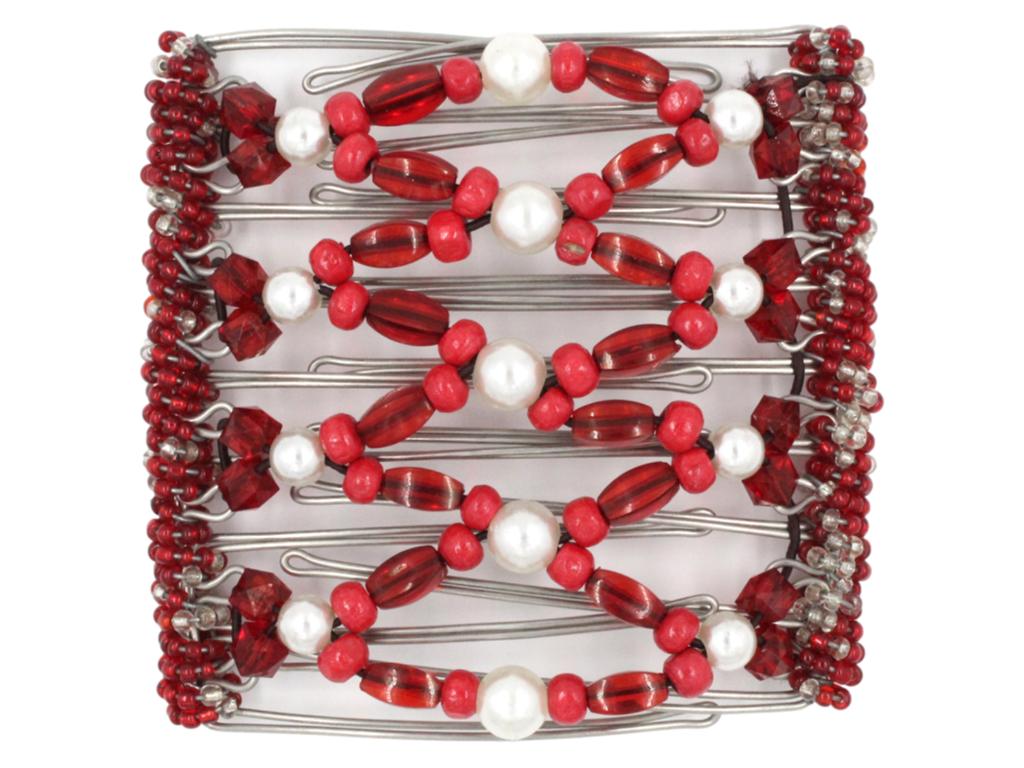 This 9 Tong Wire Hair Clip features small and large white pearls, red wood beads, and lots of dark red translucent acrylic beads. Yummy candy cane seed beads are sprinkled on the edges of the hair clip. Note: Bead color may have a slight variation from those displayed due to different devices.