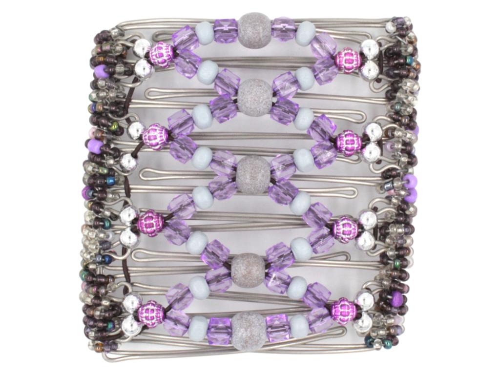 This stunning 9 Tong Wire Hair Clip features gray faux stone center beads; geometrical, translucent amethyst acrylic beads; small light gray wood beads; fuchsia decorated beads; and small silver beads. This is really a gorgeous hair clip for the purple lover! Note: Bead color may have a slight variation from those displayed due to different devices.