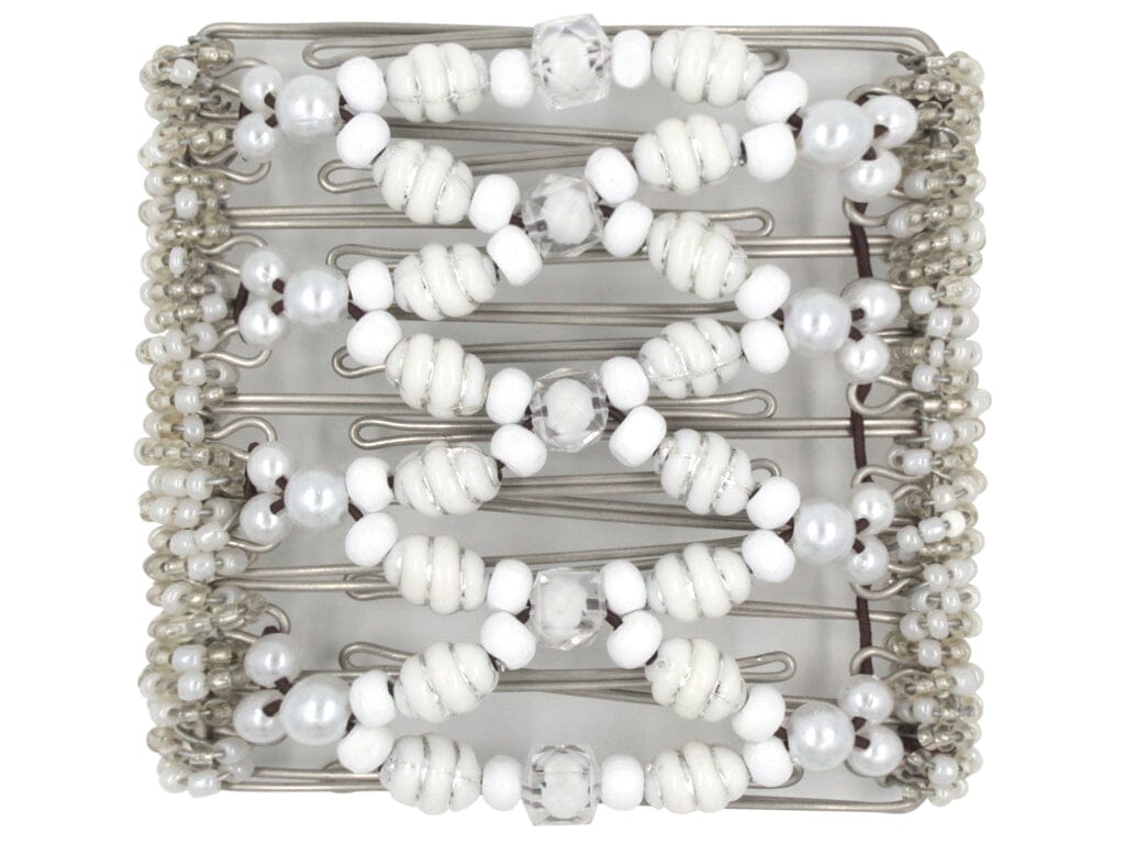 This 9 Tong Wire Hair Clip features all white vibes. Clear faceted translucent acrylics, white and silver etched beads, rustic white wood beads, and white pearl beads are all featured in this stunning hair clip. This clip is perfect for wedding or bridal hair. Note: Bead color may have a slight variation from those displayed due to different devices.