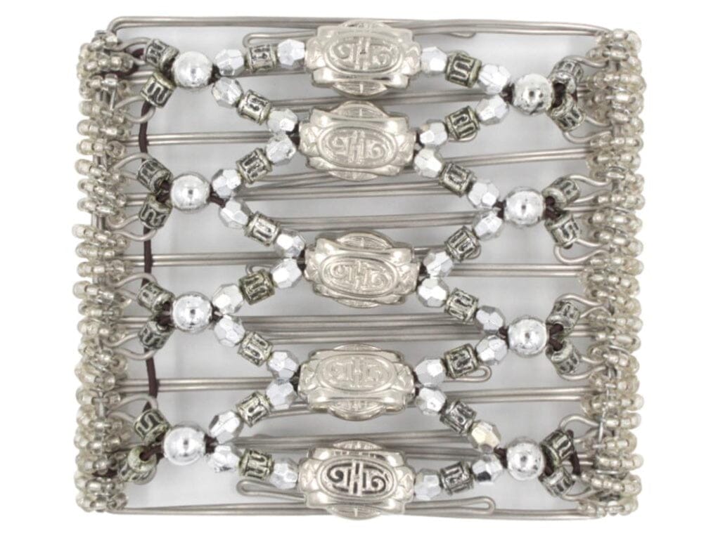 Silver Bells! This festive 9 Tong Wire Hair Clip features all shiny silver beads, including puffy center beads, and clear seed beads along the edges. This would be perfect for that fancy party, prom, or evening event! Note: Bead color may have a slight variation from those displayed due to different devices.