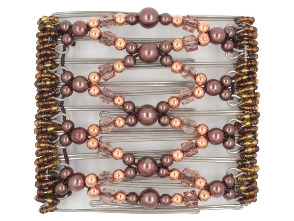 This 9 Tong Wire Hair Clip features luxurious brown tones, including mocha center pearly beads, shiny copper beads, and translucent smoked topaz faceted acrylic beads. Note: Bead color may have a slight variation from those displayed due to different devices.
