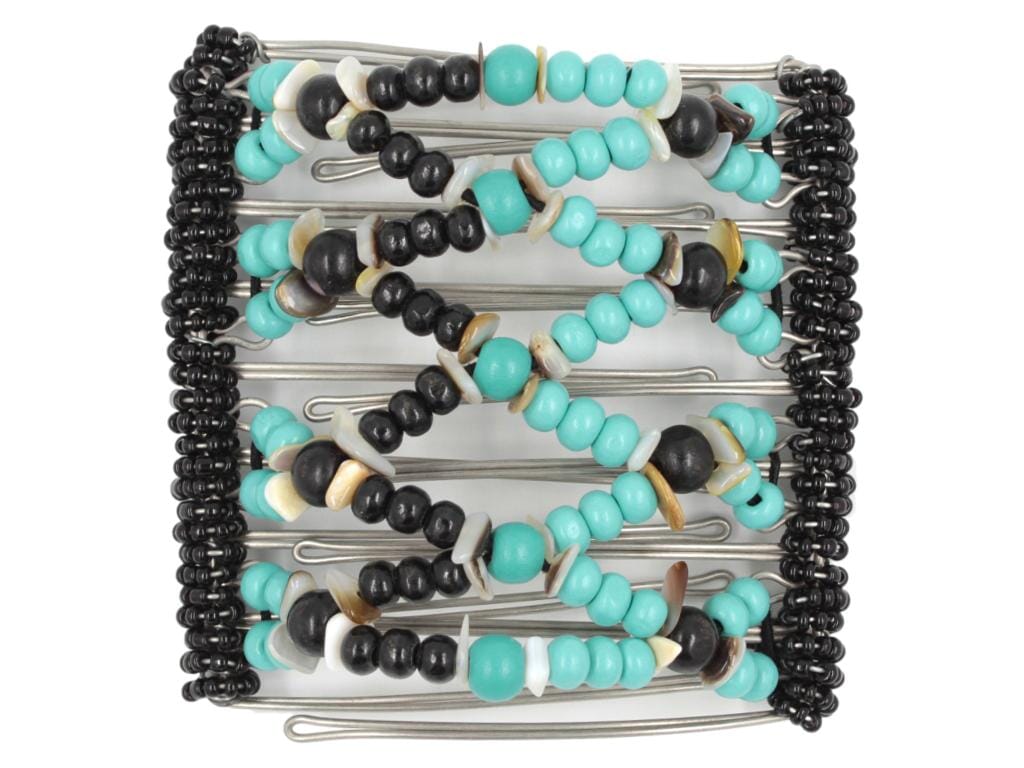 This exquisite African Butterfly Wire Hair Clip - 9 Tong 569 is an accessory whose artistry is truly unmatched. Its combination of tumbled and polished Mother of Pearl sea shells and solid wood beads in both black and aqua creates a luxurious and eye-catching design, perfect for any stylish occasion. Mother of Pearl brings the gentle healing power of the sea. It is a stress relieving stone; relaxing, soothing, and calming to the emotions by becoming more harmonious and balanced. It is also thought to symbolizes good luck and prosperity. Note: Bead color may have a slight variation from those displayed due to different devices.
