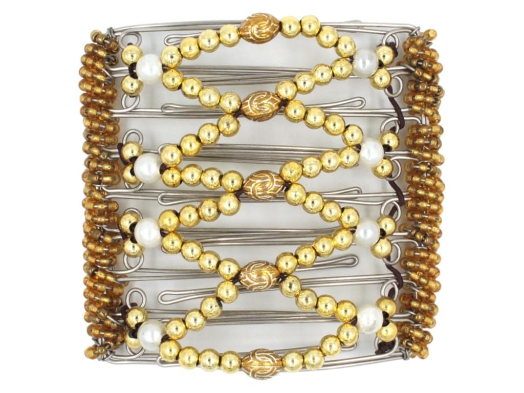 Transform your hairstyle with this stunning 9 Tong Wire Hair Clip. Embellished with glittering gold mirror beads, decorative center beads, and elegant white accent pearl beads, this hair accessory is sure to turn heads wherever you go. The secure wire clip adds a touch of shimmer to your look, making it perfect for any occasion. Whether you're dressing up for the holidays or a casual night out with friends, this hair clip will add confidence and sophistication to your ensemble. Don't miss out - get your own dazzling 9 Tong Wire Hair Clip now!