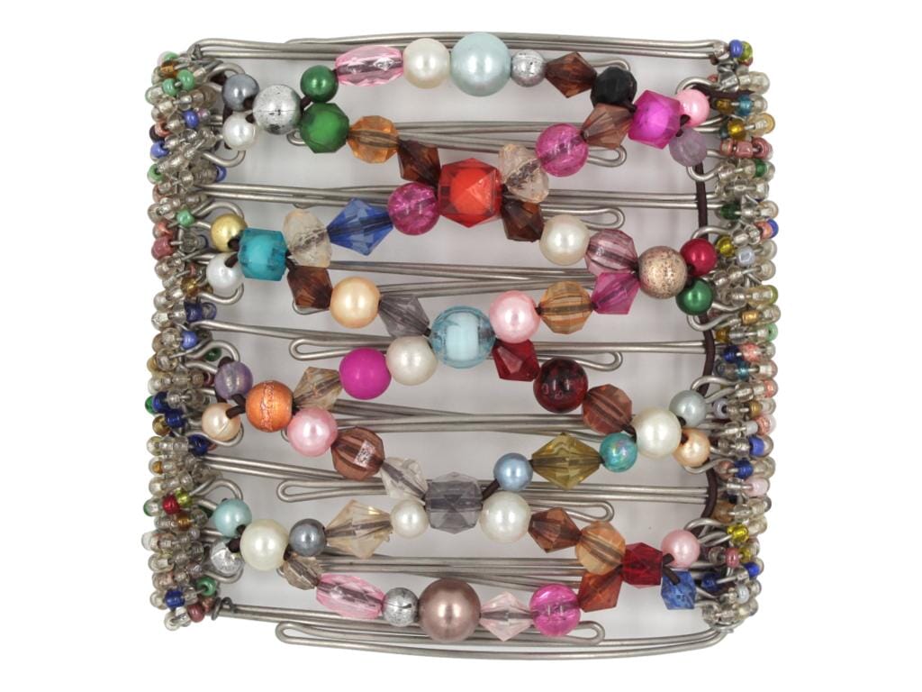 Are you looking for a unique hair clip that will help make a statement and spruce up your look? Look no further! This exclusive one-of-a-kind 9 Tong Wire Hair Clip is everything your thick hair needs! It is crafted with all different sizes, textures, and color acrylic beads for maximum style appeal. This versatile and stunning fiesta will be sure to turn heads and leave a lasting impression. It is the perfect way to accessorize any outfit while adding a touch of fun and creativity to your look. The sleek and modern design pairs perfectly with with, long and thick hair! With this piece, you can feel free to express your individual sense of style and let your personality shine through.