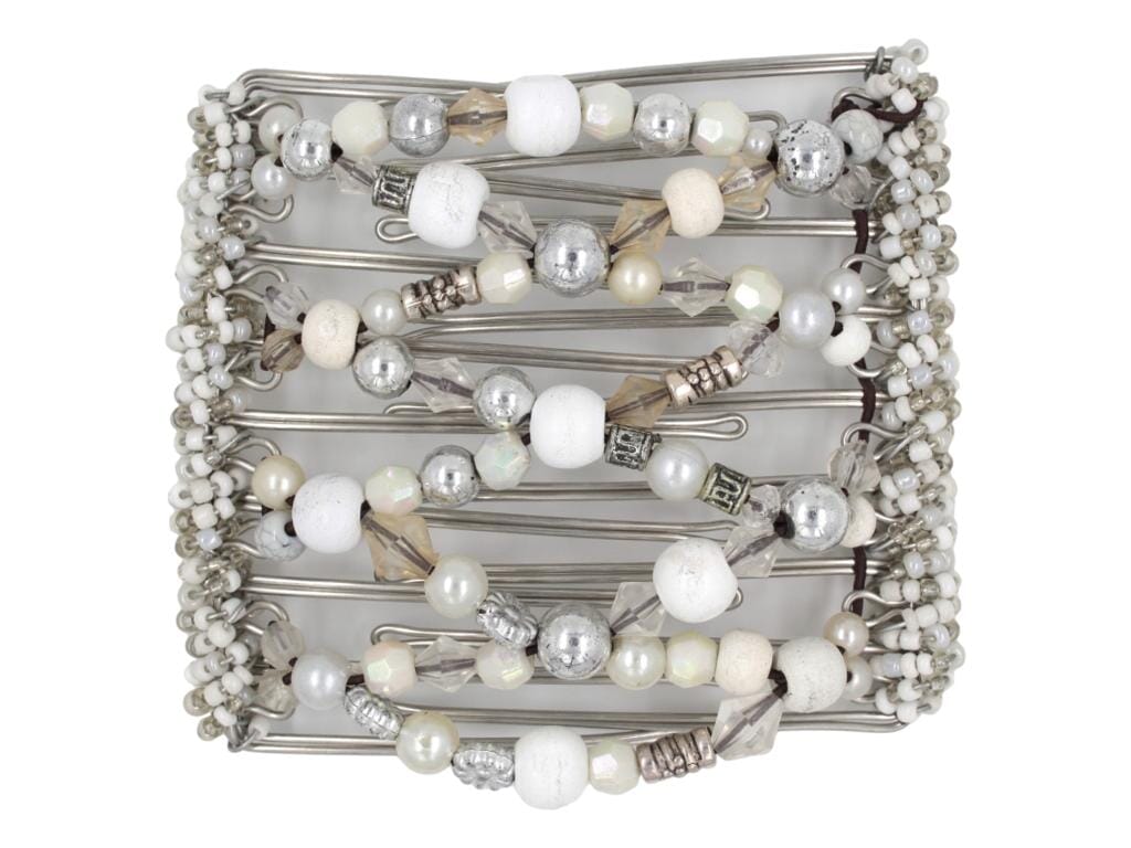 This one-of-a-kind African Butterfly 9 Tong Wire Hair Clip is the perfect accessory for any special occasion. It boasts a vibrant mix of clear, white translucent acrylic beads, rustic white and natural wood beads, silver, and luminous white pearly beads. With a variety of shapes and sizes, this hair clip stands out for its beautiful details while still blending in with any shabby chic or boho wedding hair style.