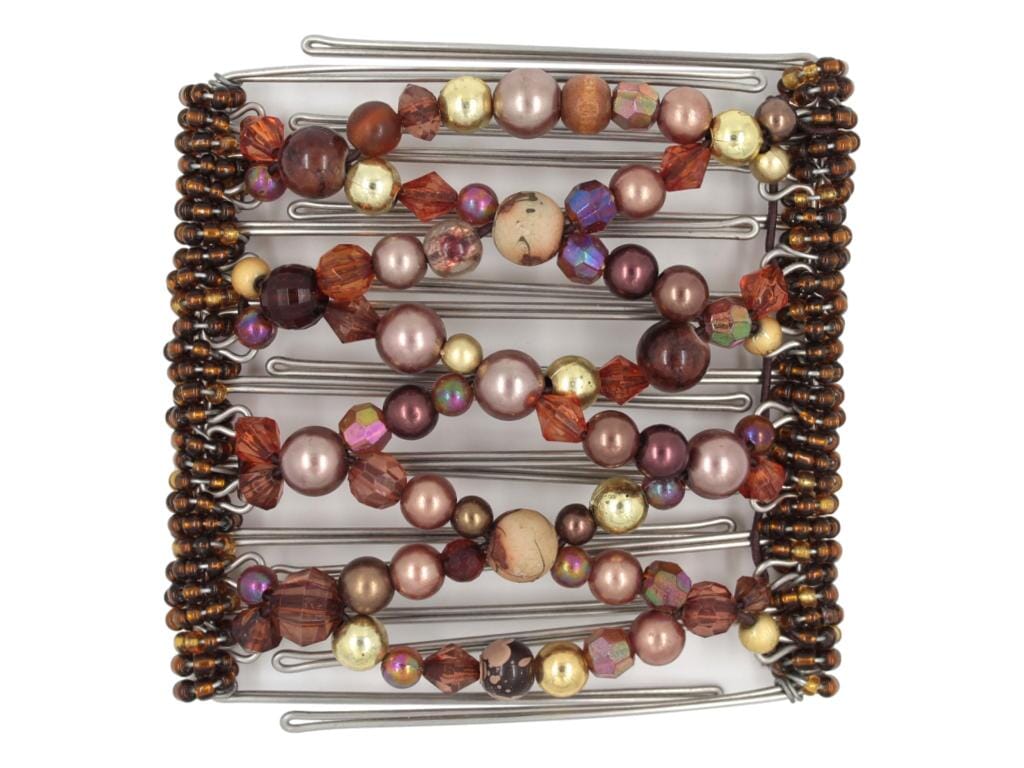 Experience the charm and uniqueness of this 9 Tong Wire Hair Clip. With its earthy tones and eclectic bead design, it's a perfect gift for the fashion-forward individual or a special treat for yourself. This size is perfect for its versatility, as it can accommodate various hair types and styles. Whether you're styling an updo for a special occasion or just need a quick fix for a casual day, this hair clip will surely add a touch of elegance and sophistication. It is adorned with a variety of acrylic beads, all of which have been carefully threaded onto a durable elastic.