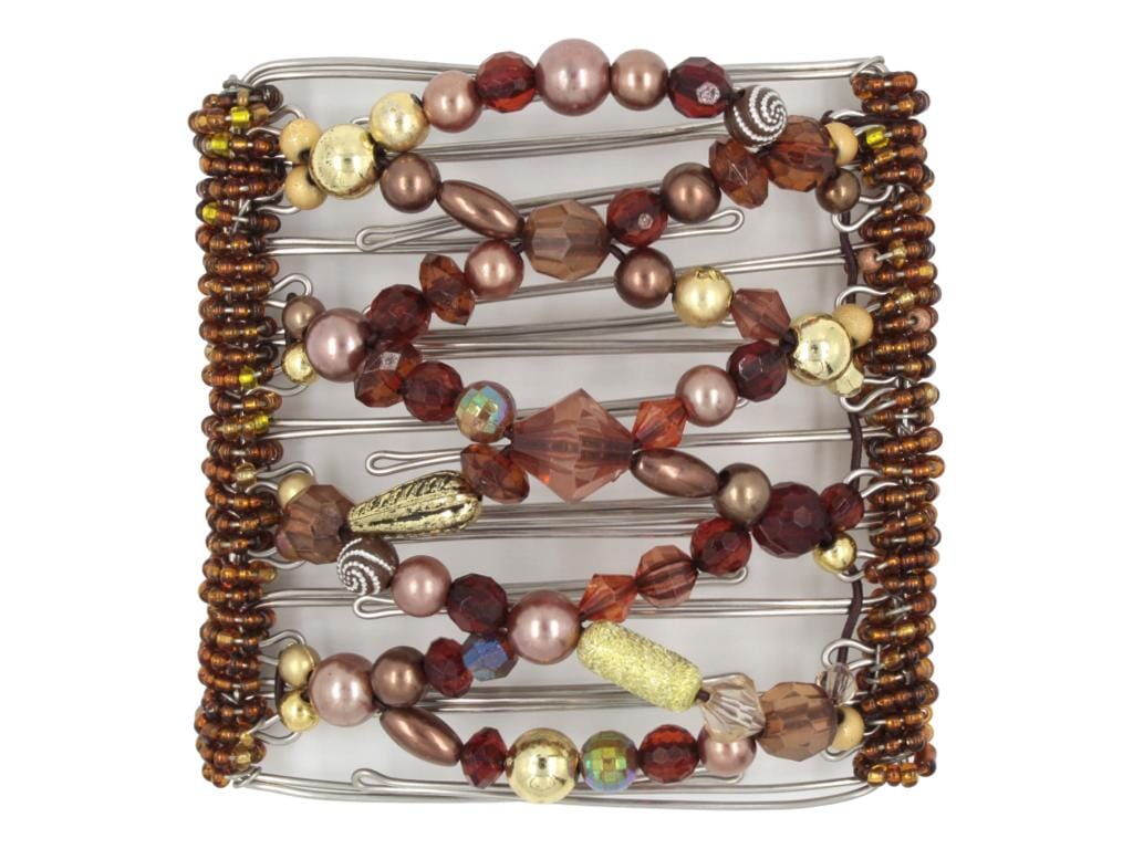 Experience the charm and uniqueness of this 9 Tong Wire Hair Clip. With its earthy tones and eclectic bead design, it's a perfect gift for the fashion-forward individual or a special treat for yourself. This size is perfect for its versatility, as it can accommodate various hair types and styles. Whether you're styling an updo for a special occasion or just need a quick fix for a casual day, this hair clip will surely add a touch of elegance and sophistication. It is adorned with a variety of fancy acrylic beads, all of which have been carefully threaded onto a durable elastic.