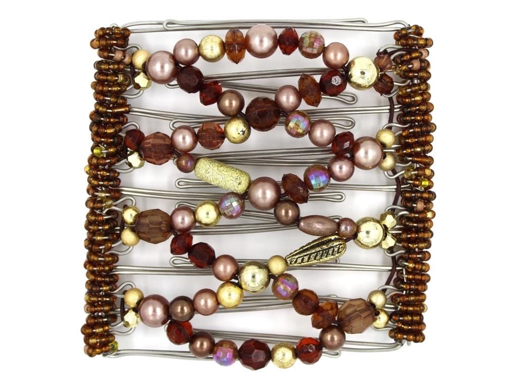 Experience the charm and uniqueness of this 9 Tong Wire Hair Clip. With its earthy tones and eclectic bead design, it's a perfect gift for the fashion-forward individual or a special treat for yourself. This size is perfect for its versatility, as it can accommodate various hair types and styles. Whether you're styling an updo for a special occasion or just need a quick fix for a casual day, this hair clip will surely add a touch of elegance and sophistication. It is adorned with a variety of fancy pearls and acrylic beads, all of which have been carefully threaded onto a durable elastic.